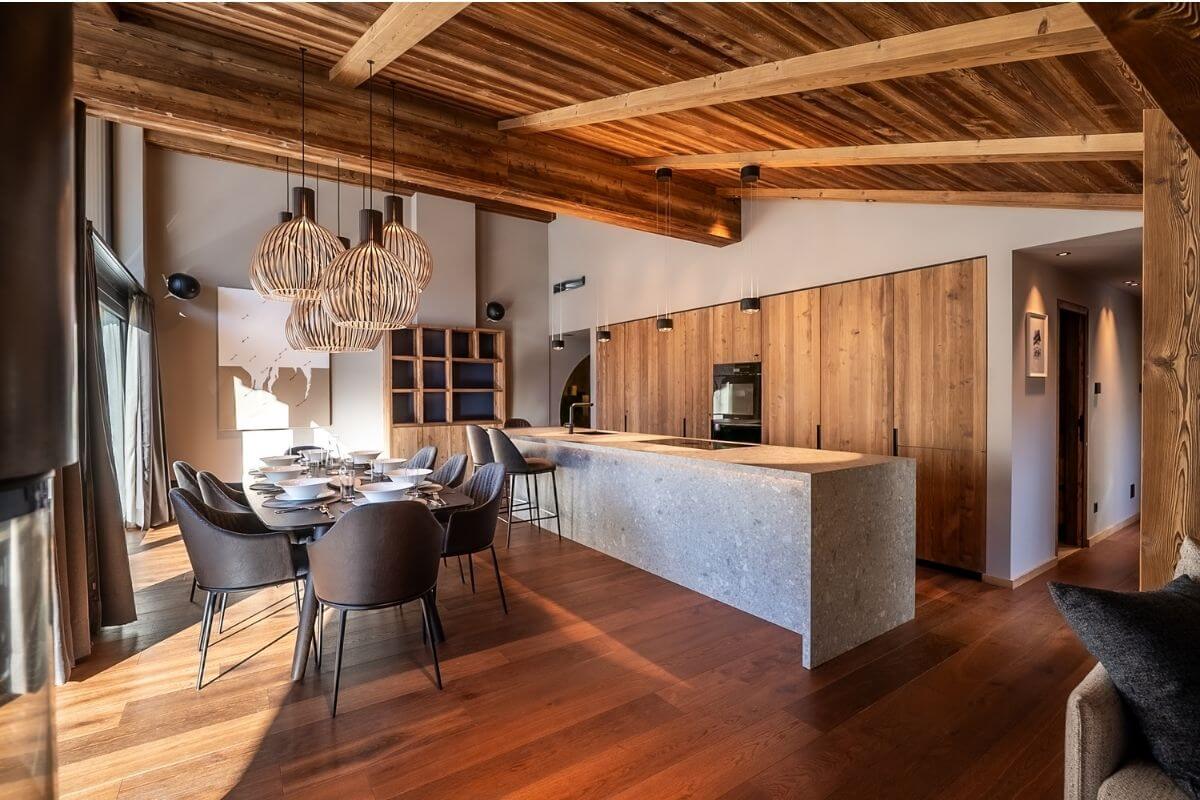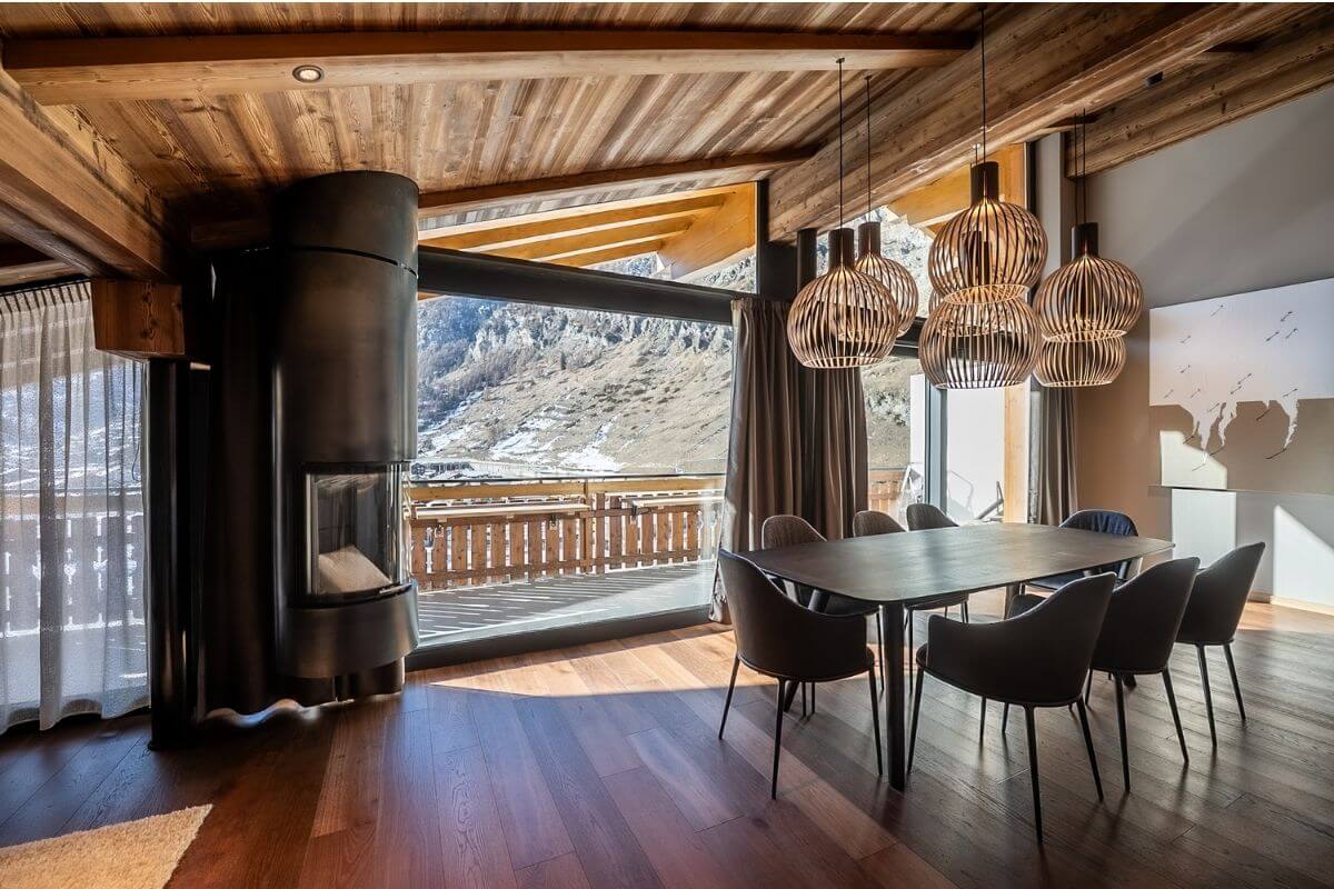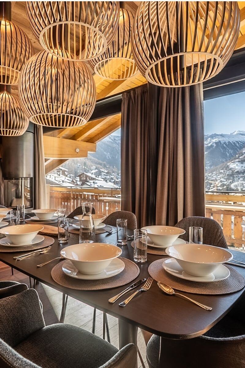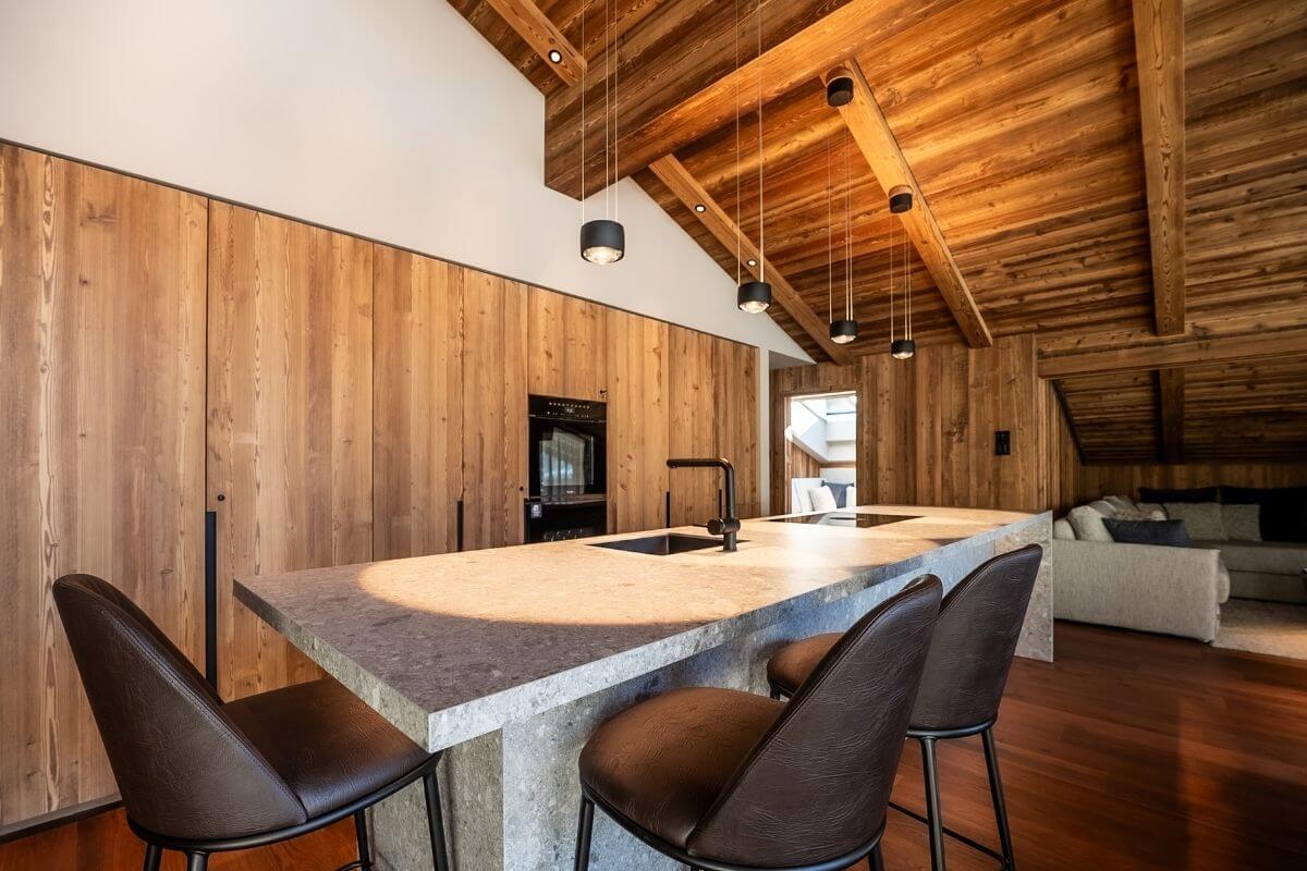 Welcome to the highest level of comfort. The heart of this 110 m² penthouse is the impressive living area under the open roof rafters, where authentic timber meets modern design. At the large dining table for up to 8 people, you can enjoy culinary experiences with a view of the Matterhorn and engage in lively discussions with family and friends.